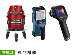 - サーモグラフィーや赤外線センサー等の専門機材を使用して、見えない部分を人間の感覚だけではなくより正確に調査・報告いたします。ホームインスペクションでは、実績ある専門家の目視と専用機器で化学的に診断します。専門機器もより高度な検査ができるものをそろえております。