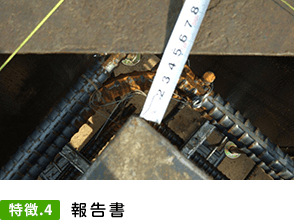 - 報告書は写真を使ってお客様に分かり易く、報告いたします。もちろん、現場が図面とちがっていたり、施工ミスと判断した場合、その場で施工会社に修正をお願いし、お客様にも口頭と報告書を使いご報告いたします。